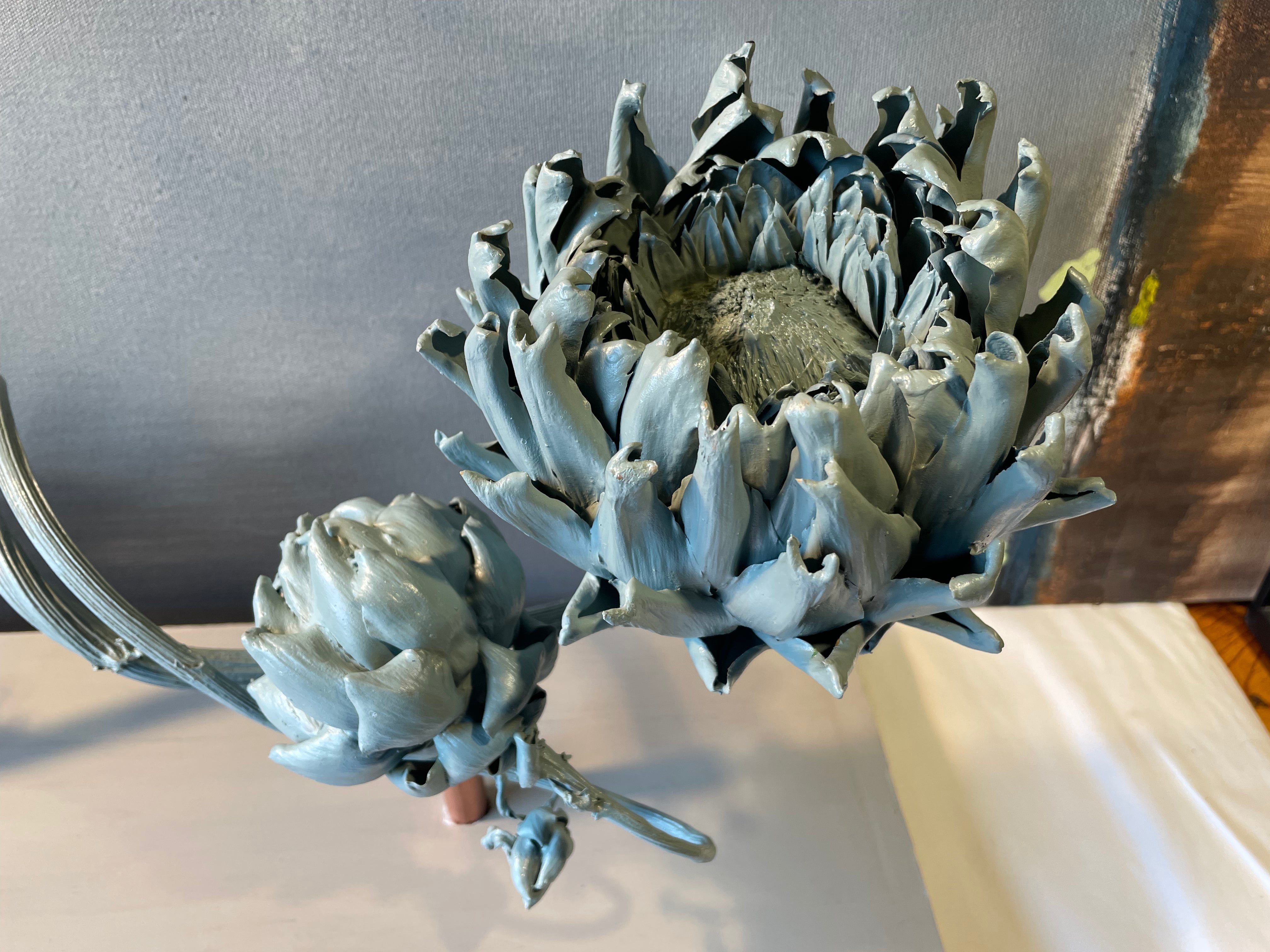 Finished in a soft duck-egg blue, the artichoke buds feel calm and airy, yet sculptural and expressive. The gentle matte finish highlights the layered leaves and organic texture, while the curved stems introduce a sense of rhythm and movement — almost musical in form.