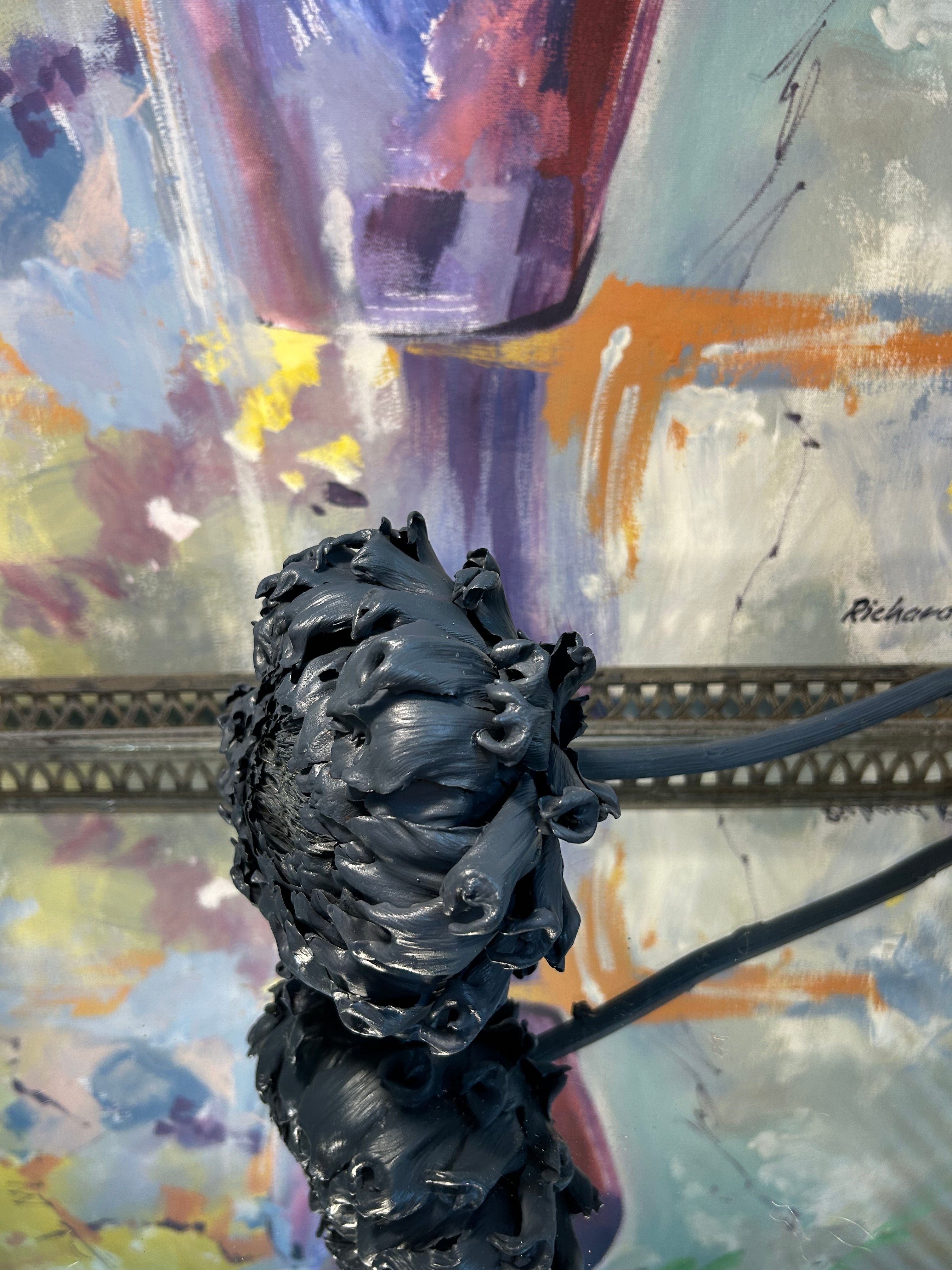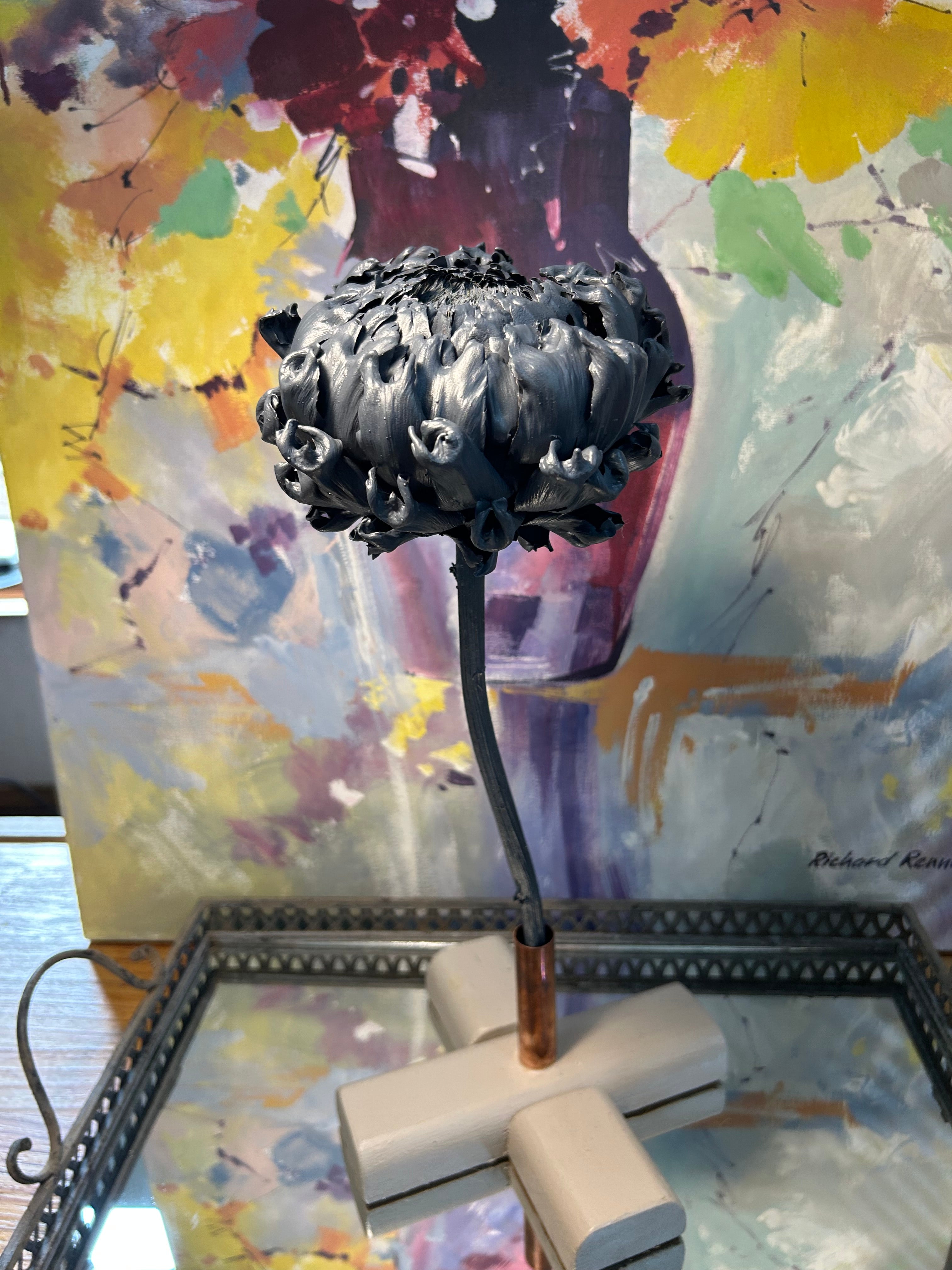 This large artichoke bloom is captured in a rare, in-between moment — not fully open, yet no longer closed. Finished in a soft blue, the flower reveals its outer leaves gently lifting at the top, forming a shape reminiscent of a heart. It is a piece filled with feeling: vulnerable, strong, and deeply alive.