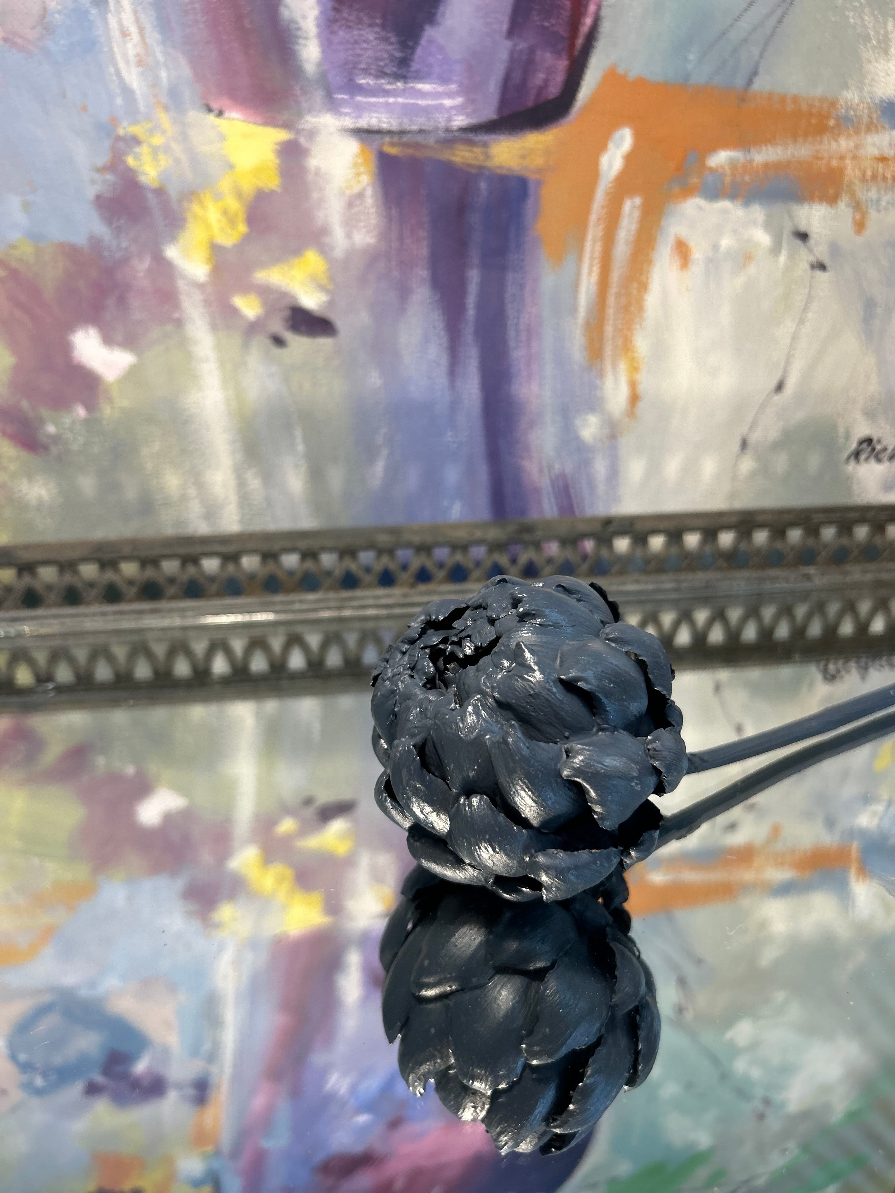 Delicate in scale yet quietly resolute, this small closed artichoke bud rises on a long, slender stem, finished in a blue that feels both calming and introspective. Still tightly held, the form speaks of inner strength — the kind that grows slowly, without spectacle.