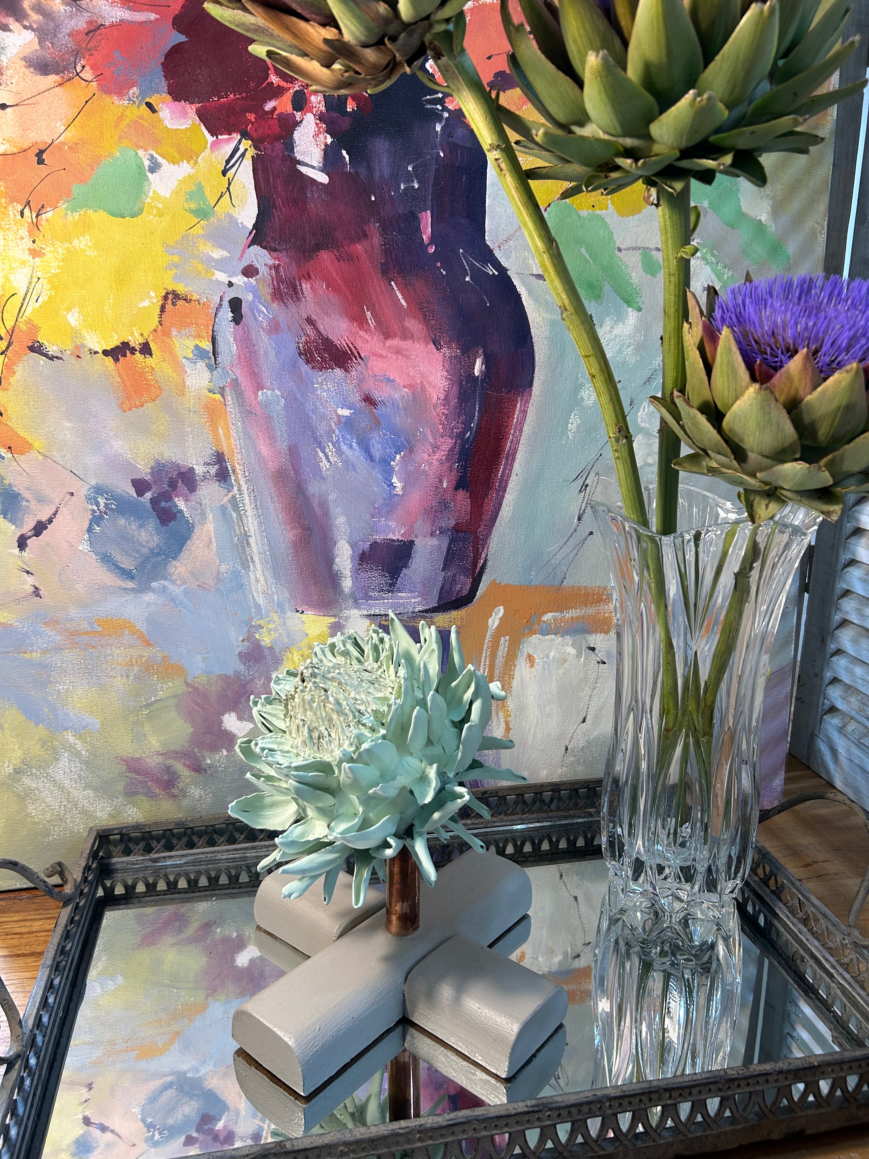 This mint green cemented artichoke flower is captured in bloom — a quiet celebration of strength, growth, and beauty. The sculpture makes a gentle yet confident statement, drawing the eye without overpowering its surroundings.